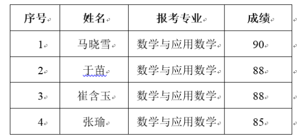根据《色情网站 2023年第二学士学位招生简章》及《2023年数学与应用数学专业第二学士学位招生考试方案》有关要求,学院对报名的4名学生进行初审并组织进行了考核,现将成绩公示如下: