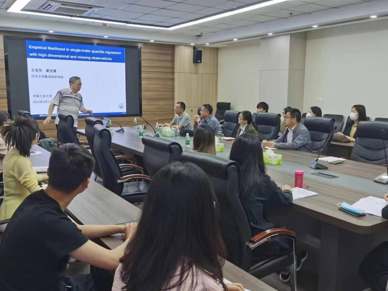 梁汉营教授在本次报告中基于分布的分位数定义,给出分位数回归的概念,指出在缺失数据、高维数据下普通分位数回归模型的不足,结合链接函数、经验似然函数法和SCAD罚方法对模型进行了修正。基于拟合数据和现实数据,对分位数回归模型进行验证,结果表明,在高维缺失数据下,经验似然单指标分位数回归模型有效。梁教授用通俗易懂的语言,结合生活中的实例,给我院师生带来了一场经常的报告。报告会结束后,梁教授对在场师生提出的问题给出了详细解答,并就相关学术问题进行了热烈的讨论。梁汉营教授还对统计学科人才培养的现状进行了解析,指出了统计人才短缺的现状和人才培养面临的问题。