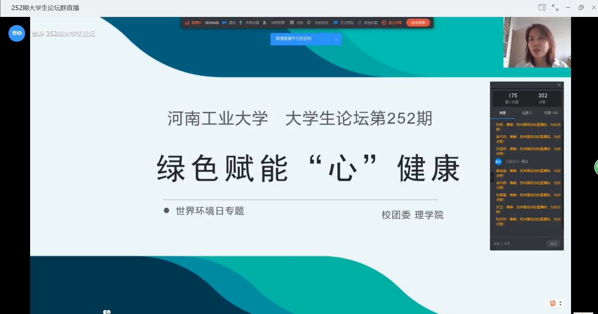 承办的主题为“绿色赋能‘心’健康”的世界环境日专题讲座,第252期大学生论坛在钉钉直播平台成功举办。活动旨在推进我校绿色学校建设进程,进一步丰富绿色学校文化内涵,强化大学生心理健康教育,帮助大学生营造健康的心理生态系统。此次论坛邀请我校全国百佳心理委员李周晋达、徐慧雅、李梦瑶进行汇报。校团委副书记鲍庆丹、社团部部长李凯歌,色情网站