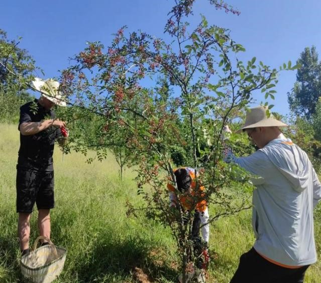 山途弯曲绵延,视野宽活,花椒树整齐排列,树枝上花椒锦簇绽放,茎干有细小的皮孔及略斜向上生的皮刺。在村名讲解了大红袍花椒的采摘方法后,小队自觉分成两组,相互协作,进行采摘体验。采摘时,大红袍花椒满手流油,香气四溢。由于花椒本身的特性,采摘过程中,手部的酥麻感比较严重,扎手的情况多有出现,这也让队员们体会到了采摘的不易。经过村民的专业指导,队员们的默契配合,大红袍花椒收获满满。